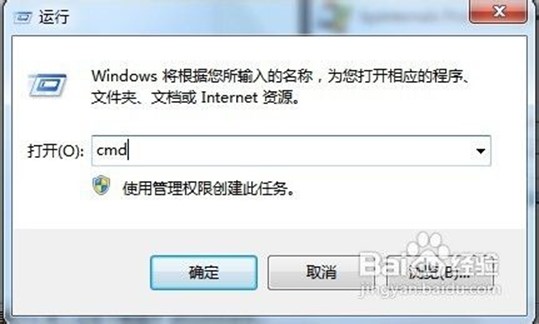 单击"开始"菜单,单击"运行"命令,在打开的运行对话框中输入"cmd"命令,单击"确定"按钮