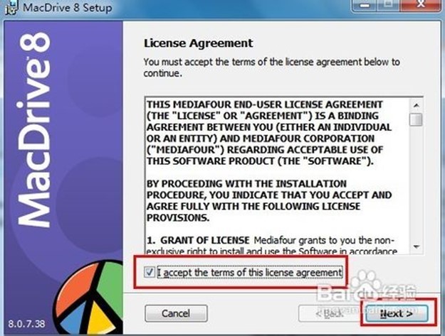 进入"MacDrive 8"安装向导,勾选"I accept the......"选项,单击"Next"按钮