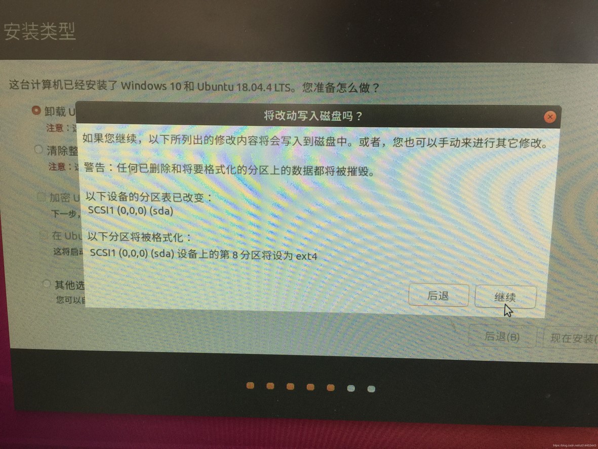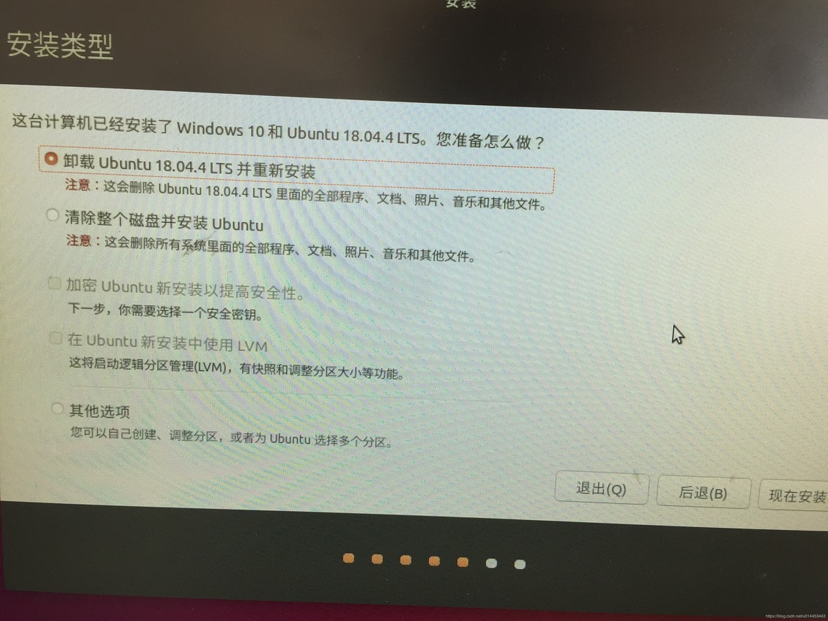 4. 选择双系统并存还是只安装Ubuntu,由于我之前安装过Ubuntu18.04LTS,这里第一项提示卸载Ubuntu 18.04LTS并重新安装,如果之前没有安装过,会显示与Windows10系统并存,选择双系统并存的选择第一项,选择只安装Ubuntu的可以选择第二项,清除整个磁盘并安装Ubuntu,这里我先选择第一项,然后点击现在安装