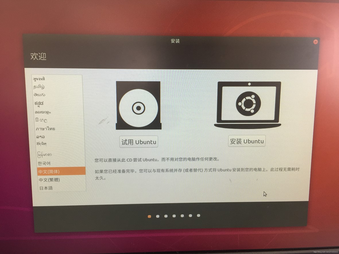 1. 选择安装语言,在语言选择栏拉到底可以看到简体中文,选择中文(简体),然后点击安装Ubuntu进入安装