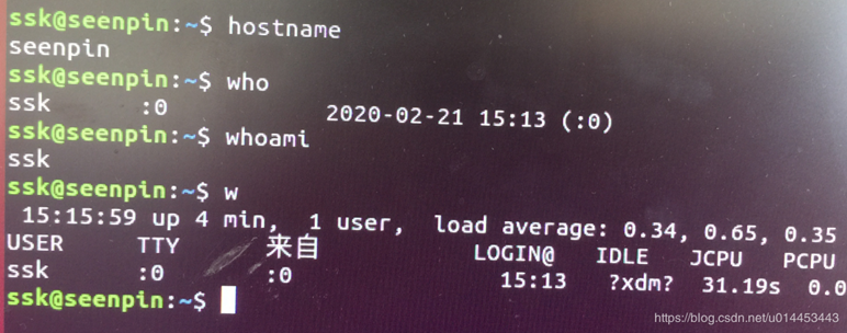 用户名:->指的是计算机登录之后的用户名,在shell终端中使用w命令可以查看当前所有登录过的用户名,使用who/whoami可以查看当前登录的用户名,使用ssh远程登录时,需要使用的就是用户名,如下图所示