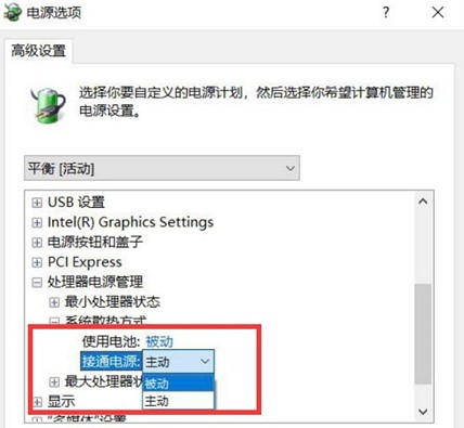 第二步选择更改高级电源设置,进入电源选项后,用滑块一直往下滑,然后就会看到一个处理器电源管理,下面有一个系统散热方式,在下面的使用电池和接通电源都改成被动就可以了。