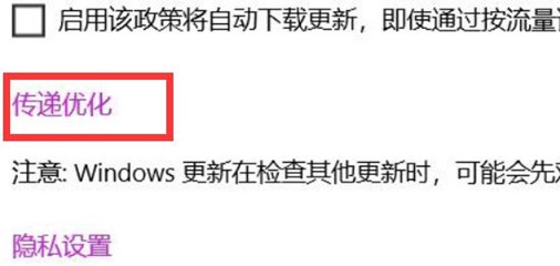 打开更新和安全,然后找到windows更新中的高级选项,进入高级选项后,下拉找到传递优化,点击进入。
