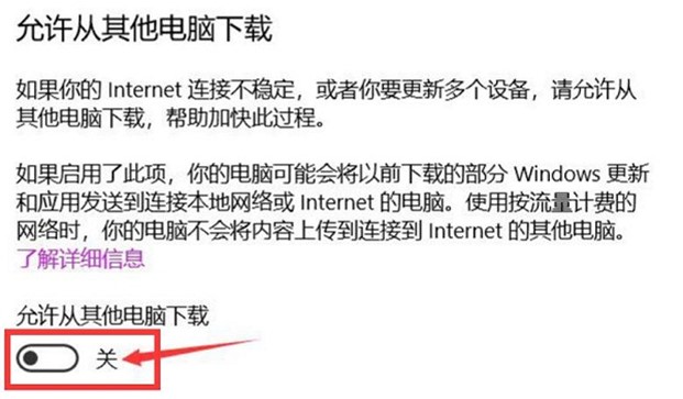 进入传递优化后,在允许从其他电脑下载下面的选择中选择关闭就可以了。