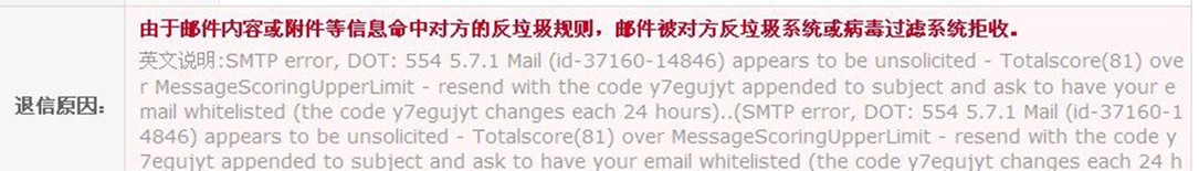 由于邮件的内容或信息命中对方的反垃圾邮件规则,邮件被对方反垃圾邮件或病毒系统拒收。