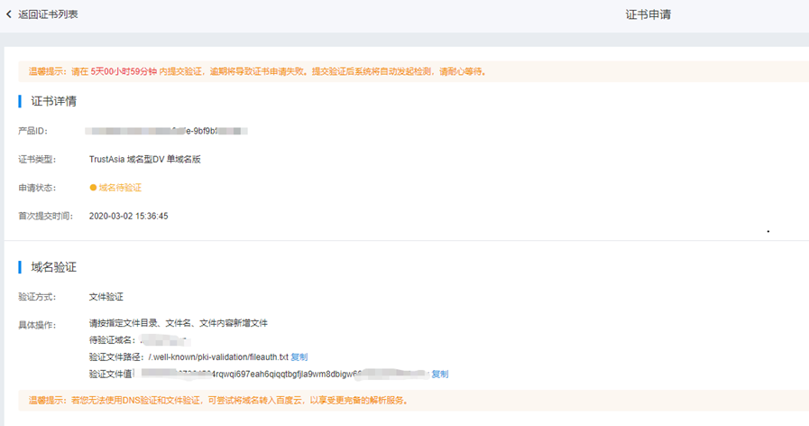 注意: 文件验证步骤中的文件验证路径不能更改,如因路径中的特殊符号造成验证流程无法继续,请选择DNS验证方式。