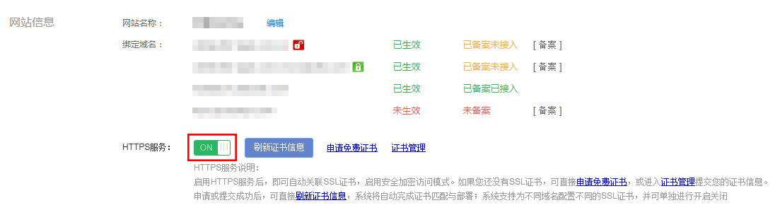 如果没有显示任何图标,代表该域名没有匹配到SSL证书,此时请检查是否已经配置了该域名的SSL证书并点击"刷新证书信息"按钮,重新匹配证书。