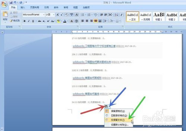 通过使用"Ctrl+C"和"Ctrl+V",将原文档的内容复制至新文档内并在文档最后出现的"粘贴选项"按钮(图中红色箭头所指)中,点击其下拉三角形(图中蓝色箭头所指),在弹出的菜单中点击"仅保留文本"(图中绿色箭头所指)
