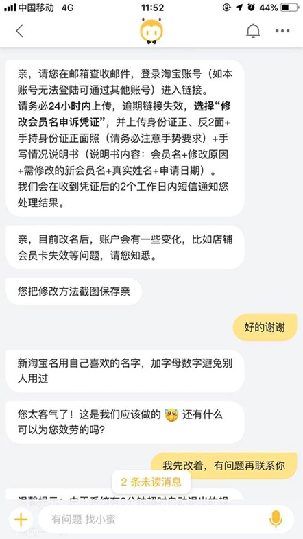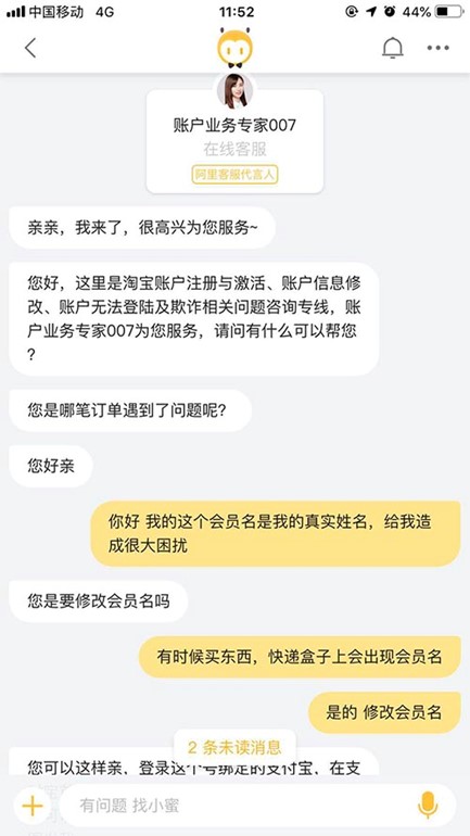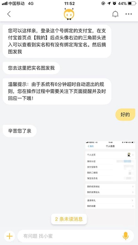 比如飞鸟的淘宝号有十多年了,之前注册的时候没注意那么多,就直接用真实姓名注册了,之后一直被困扰着。之后客服要求我登陆本淘宝号绑定的支付宝号,然后截图以证明我的真实姓名和会员名雷同