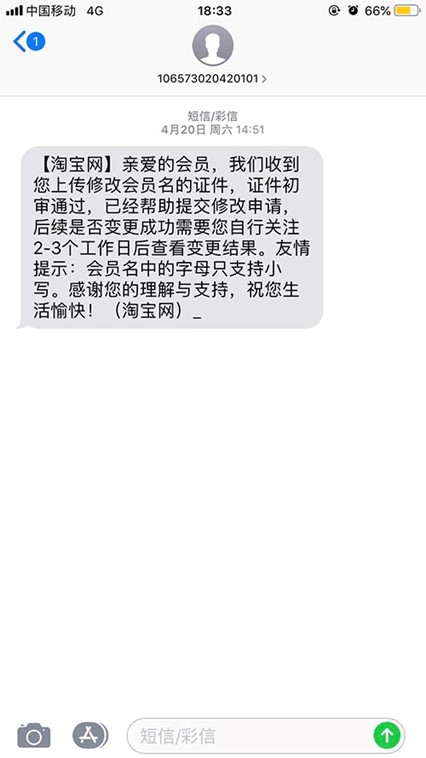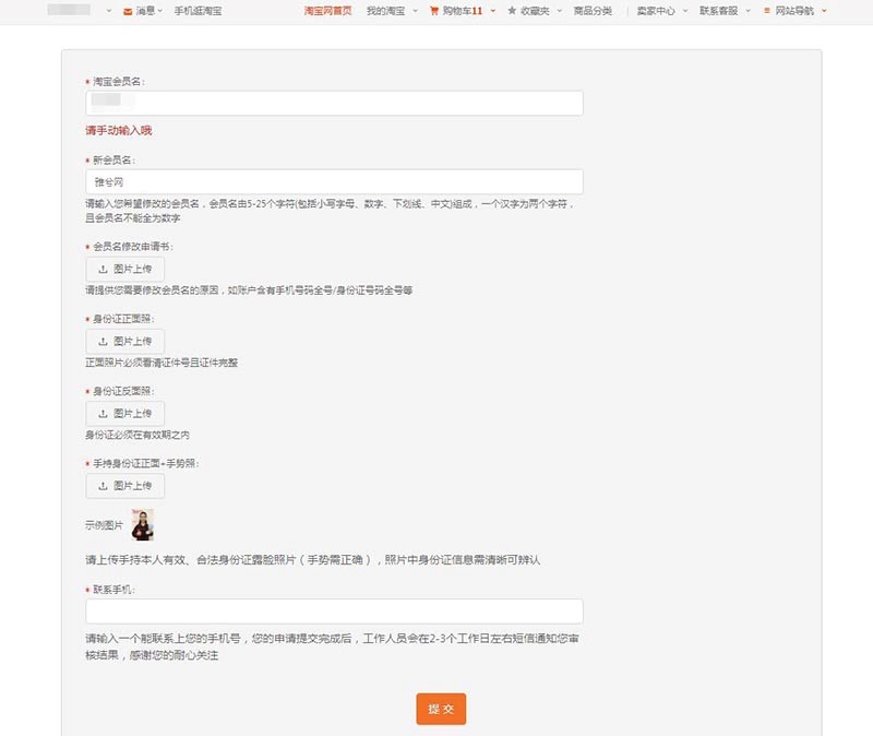 如果你的资料齐全、理由充分,那么耐心等待1-2个工作日就会收到淘宝的短信,此时说明会员名修改已经受理了,后面再等个一两天就会更新到所有的系统,重新登录淘宝就会发现你的会员名已经成功修改了