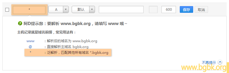 由于我演示站的安装是在目录中的,所以只能使用子目录。如果你是根目录并且是在线搭建的程序(我的演示站点是本地搭建的),首先会让你选择使用子目录还是子域名。子目录就是类似 http://www.bgbk.org/demo 这样的,子域名就是类似 http://demo.bgbk.org 这样的。使用子域名需要支持泛解析,就是 DNSPod 中的*,如下图: