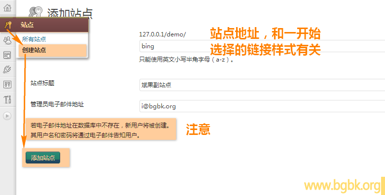 进入 站点 → 创建站点 来创建一个站点,其中的的管理员电子邮箱要注意,如果填写的电子邮箱已经在数据库存在,也就是说已经存在这个用户,那么这个站点将会归这个用户所管;如果填写的电子邮箱数据库中不存在,则系统会自动创建这个用户,并把站点归这个用户所管。