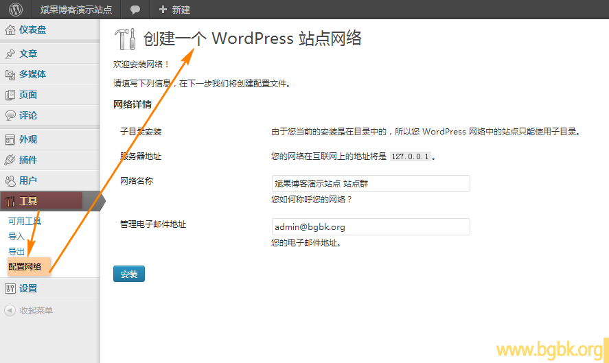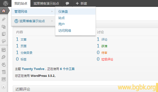 超级管理员(即安装WordPress时填写的用户)可以随意创建、删除和管理站点,这样我们可以以超级管理员的身份登录 网络仪表盘 创建新站点。