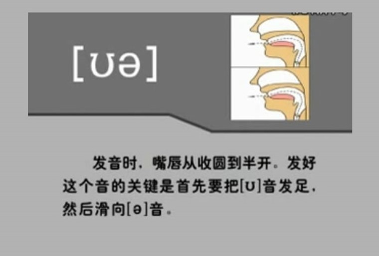 该音是个双元音,是字母our,oor,ure在单词中的读音。发音时,嘴唇从收圆到半开。发好这个音的关键是首先要把/u///音发足,然后滑向/