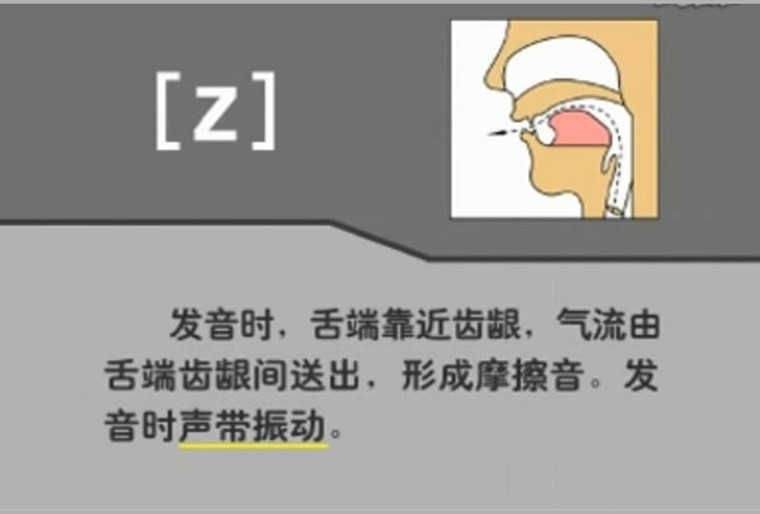 /s//z/是s的发音,/z/又是z的发音。舌齿摩擦辅音。发音时舌端靠近齿龈,气流由舌端齿龈间送出,形成摩擦音。/s/是清辅音,声带不振动;/z/是浊浦音,声带振动。