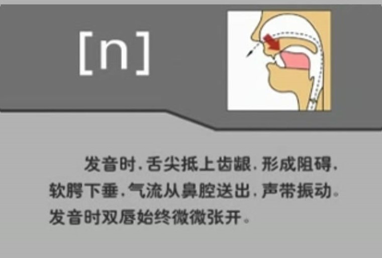 /n/是n的发音。舌尖齿龈鼻辅音。发音时舌尖抵上齿龈,软颚下垂,气流从鼻腔送出。