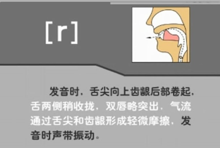 /r/是r的发音。舌尖齿龈(后部)摩擦辅音。发音时舌尖卷起,靠近上齿龈后部。舌两侧稍收扰。双唇略突出。气流通过舌尖和齿龈形成轻微摩擦。浊辅音,声带振动。