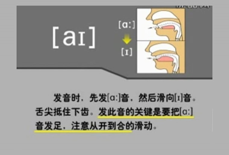 该音是个双元音,是字母i或y在单词中的发音。/ai/为双元音。先发/a/音,然后滑向/i/音。舌尖抵住下齿。发此音的关键是要把/a/音发足,注意从开到合的滑动。