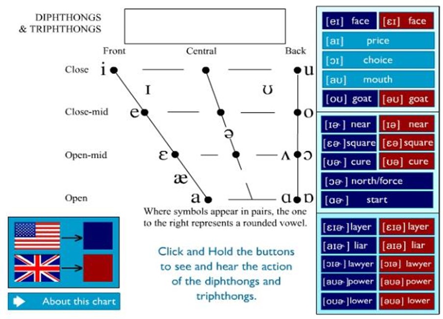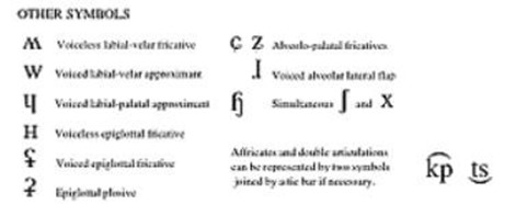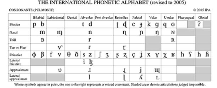 IPA国际音标表(转自约克大学) 发表评论 国际音标表(IPA Charts)国际音标,又称国际语音字母(英文International Phonetic Alphabet,简称IPA),是用于为全世界所有语言注音的符号系统。(同学们注意国际音标并不是我们学习英语所说的国际音标)这个国际音标符号表来自于约克大学,由Flash制作而成。国际音标字母最新版本由国际语音协会出版于1993(更新1996)。 下面表格是英语国际音标的元音表 转载自约克大学(http://www.yorku.ca/earmstro/ipa/) 相关文章半元音,什么是半元音,英语音标中半元音有几个,半元音有哪些舌侧音,什么是舌侧音,英语音标中舌侧音有几个,舌侧音有哪些鼻音,什么是鼻音,英语音标中鼻音有几个,鼻音有哪些破擦音,什么是破擦音,英语音标中破擦音有几个,破擦音有哪些摩擦音,什么是摩擦音,英语音标中摩擦音有几个,摩擦音有哪些