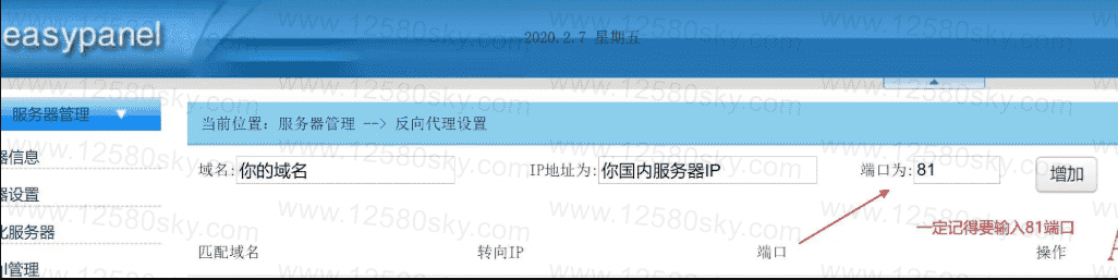 然后我们就需要反向代理绑定域名了,前面说了,你的这个海外服务器是一个桥梁,我们需要用它搭建一个桥梁,属于你需要跳的域名,和你的国内需要备案服务器的IP,最后端口输入81,切记。