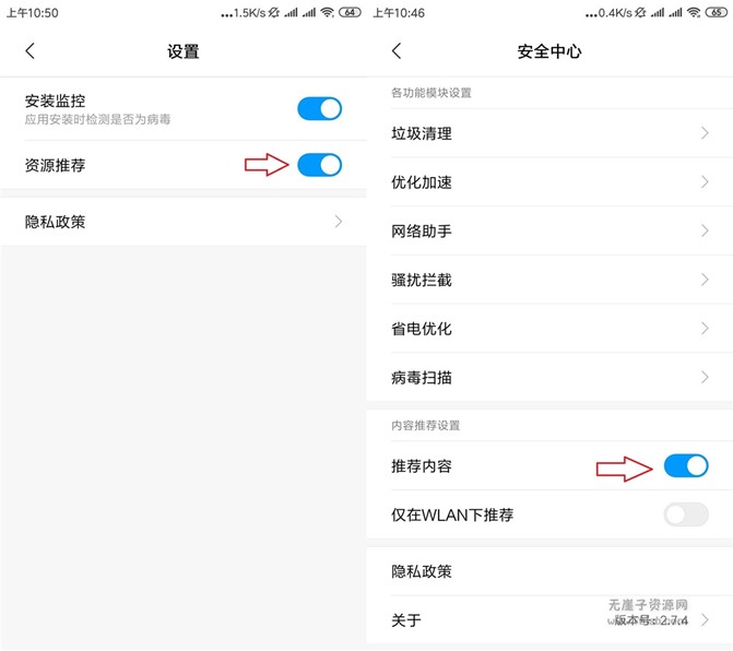 1、安全中心:设置→系统应用→安全中心→关闭"资讯推荐"。