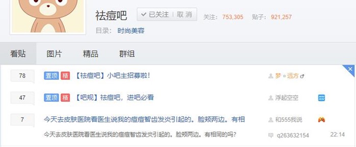 比如在百度贴吧搜索:祛痘,进入祛痘吧。