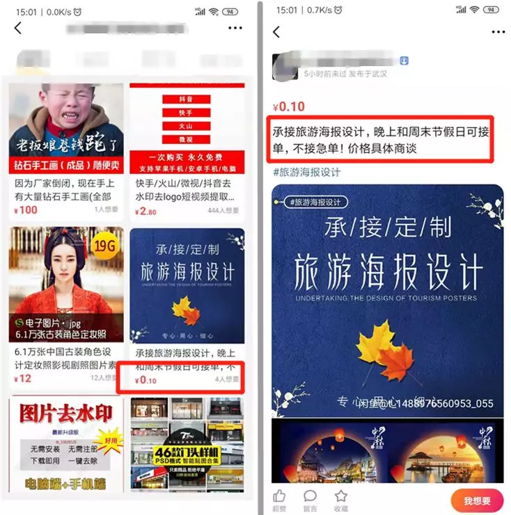 就像上图这个产品,一眼看过去1毛钱设计海报?如果你正好需要设计海报,说不定一边疑惑着这么便宜吗,一点点开了该产品详情介绍。点开一看具体的价格其实还是要具体商谈。这说起来还是从人性喜欢便宜的特性入手的。