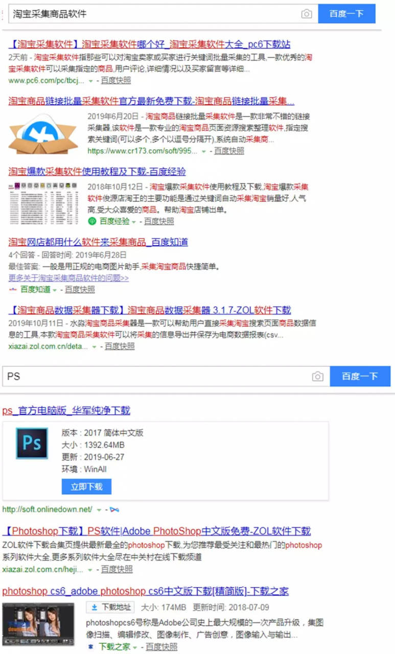 上图是我分别搜索的淘宝采集软件和PS软件的结果,这些结果点击进去其实都是单款软件的下载地址,他们在缺少这款软件时在这个网站下载,缺少那个软件又要重新搜索,又会去其他网站下载。