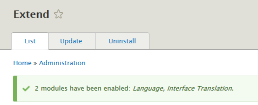 通过导航"Manage > Extend"进入扩展管理页面(admin/modules),找到 Language 及 Interface Translate 模块,勾选启用后点击安装(Install)按钮。