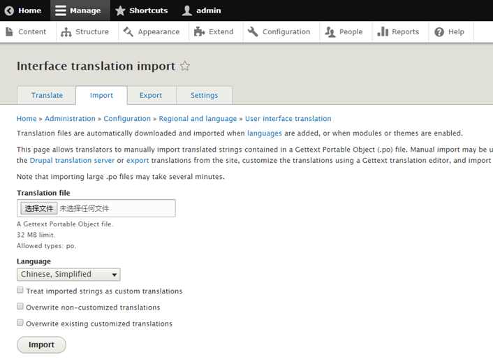 回到我们的 Drupal 8 网站,通过导航"Manage > Configuration > User interface translation > Import(标签)"进入多语言导入页面(admin/config/regional/translate/import)。
