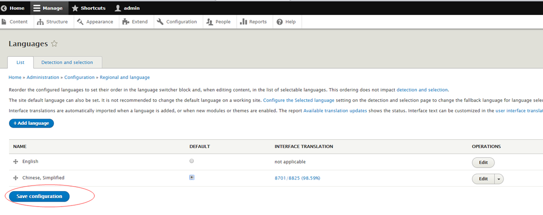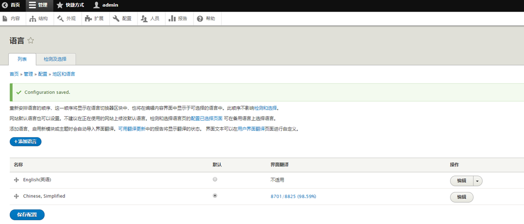 通过导航"Manage > Configuration > Language)"进入语言设置页面(admin/config/regional/language)。可以看到列表中有新导入的 Chinese, Simplified(简体中文),将其设置为默认后点击保存。