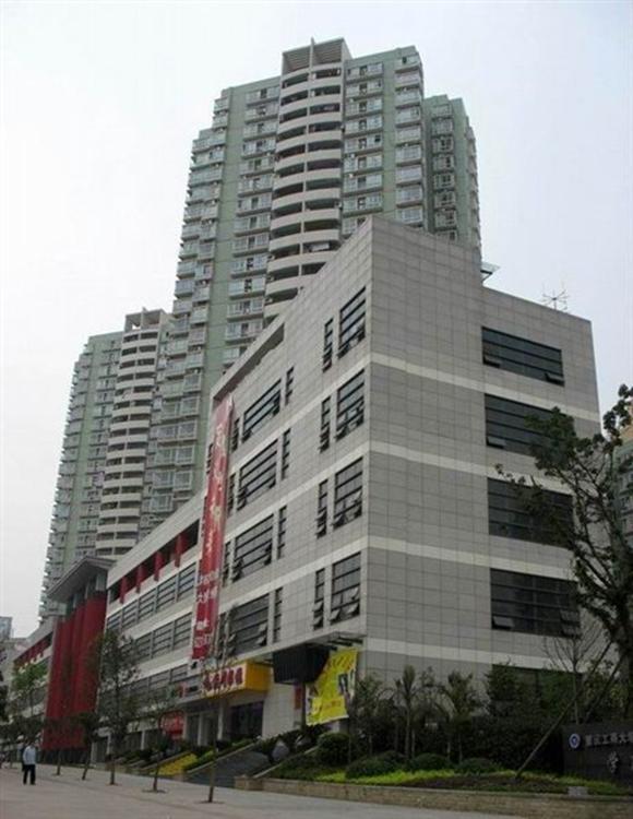 装有观光电梯的"厚德楼"充分展示了工商大学的派头,与背后的学生宿舍"小布达拉宫"相映成趣。