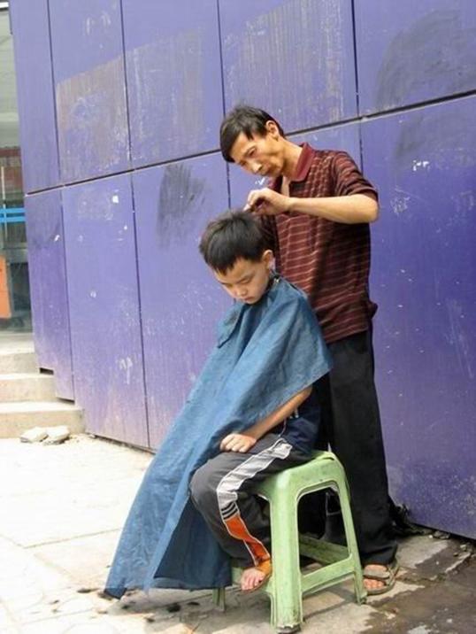 当我还是他这么大的时候也在路边剪过头,这一张是在菜园坝火车站旁边抓的。