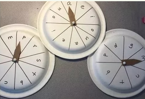好了,游戏开始,让孩子分别转动三个转盘,箭头指出的是哪三个字母,就让孩子拼读出这个单词吧。还可以和孩子比赛,看谁拼出来的单词多。
