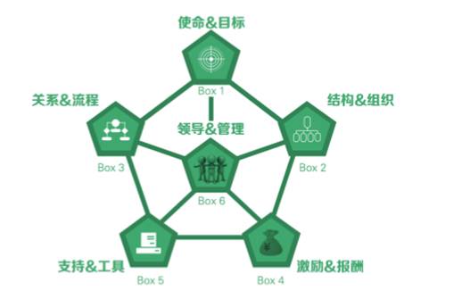 六个盒子也叫韦斯伯德的六盒模型,可以帮助我们盘点现状、打开未来,以及搭建起现实与未来的桥梁。帮助建立业务团队的组织大图起到了全面了解自已的关键作用。
