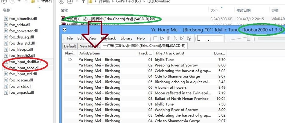 加装插件foo_input_dsdiff.dll 和foo_input_sacd.dll插件,把这两个dll文件拷到foobar2000安装目录下的components文件夹中,然后打开foobar2000,把下载的镜像文件ISO拖到上面就OK了。