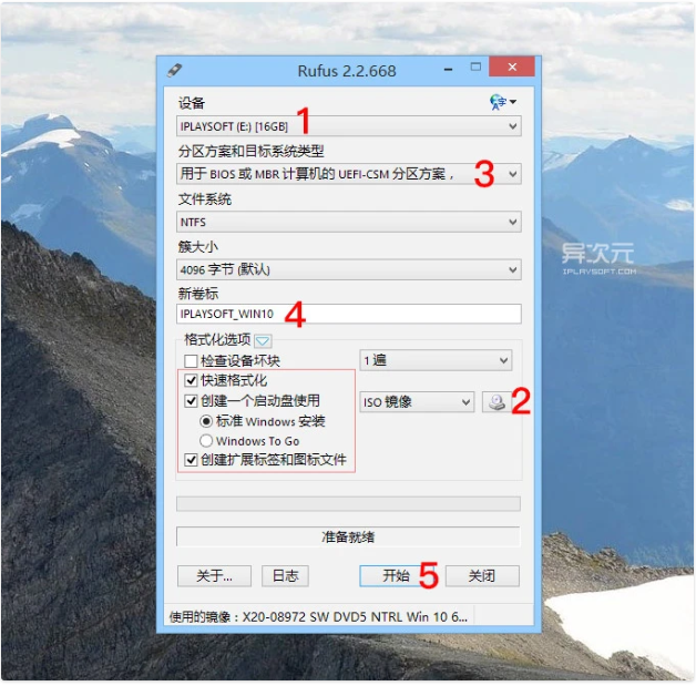 4、新卷标 (图4处) 可以随意填写制作好后的U盘名称,可以保持默认,也可以改一改来装装B,譬如可以叫做 iPlaySoft_Win10 (建议只用英文+数字)