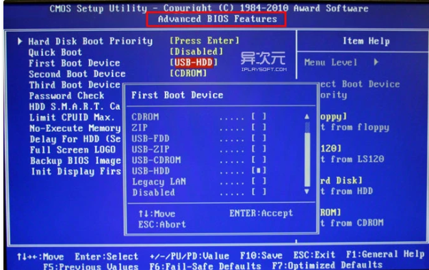 如果是英文界面就找到 “Boot” 相关的选项,中文的就找“启动”或“引导”相关的字眼,把启动项改成“USB-HDD” (每台电脑的选项名称均不一样,原谅我无法准确描述),然后保存并退出,重启电脑即可从 USB 启动。