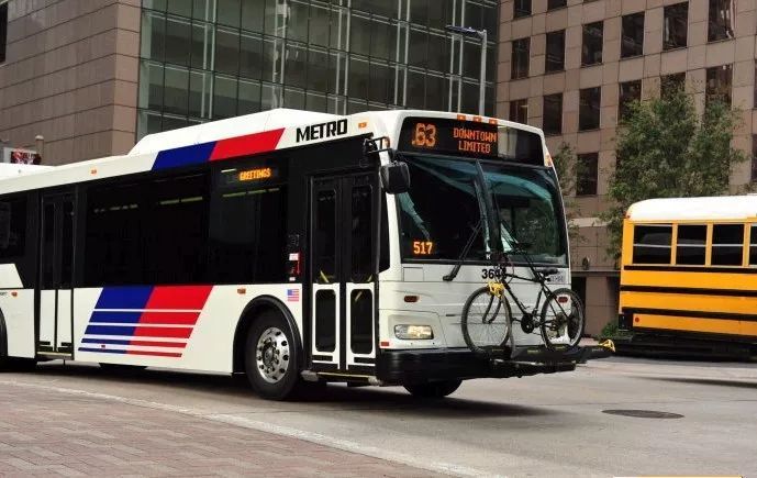 美国的公交巴士前面多了一个铁架,是用来放自行车的,而且不加钱。另外,美国公交有液压升降装置,行动不便的乘客上车时,司机会把升降板降下来,人上来了,再把板子升起来。上车后,车内坐椅可上翻,为轮椅腾出地方,再用专门的链子固定住。