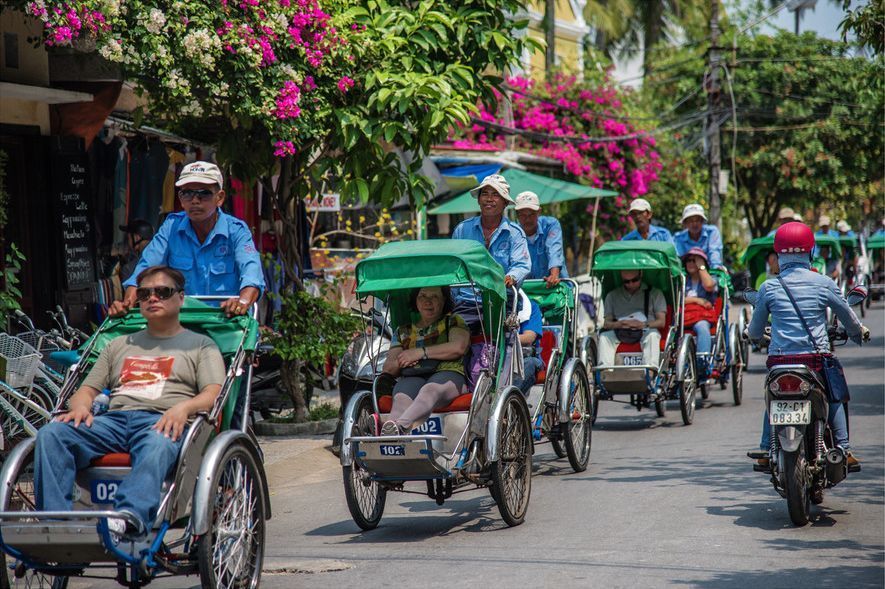越南的人力三轮车与亚洲其他地方不同,乘客坐在前,车夫在后。早期是越南人的主要交通工具,现在则是载观光客为主。