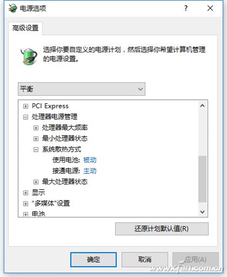 如果是系统默认的"被动",速度改成"主动",这样不管大家的笔记本是在何种运行状态,风扇都会持续运转散热,不会等到温度飙升临界点的时候再工作了。