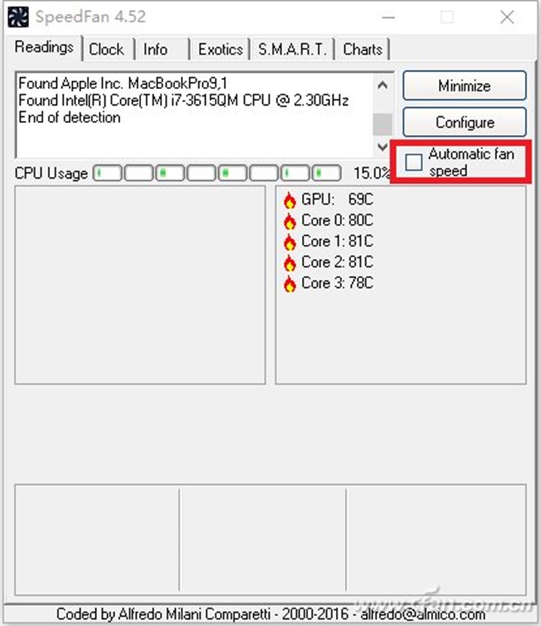 启动后它会在界面直接显示出电脑硬件的温度(主要是处理器、主板和显卡的温度),懒人可以勾选"Automatic fan speed"让它自动控制风扇。