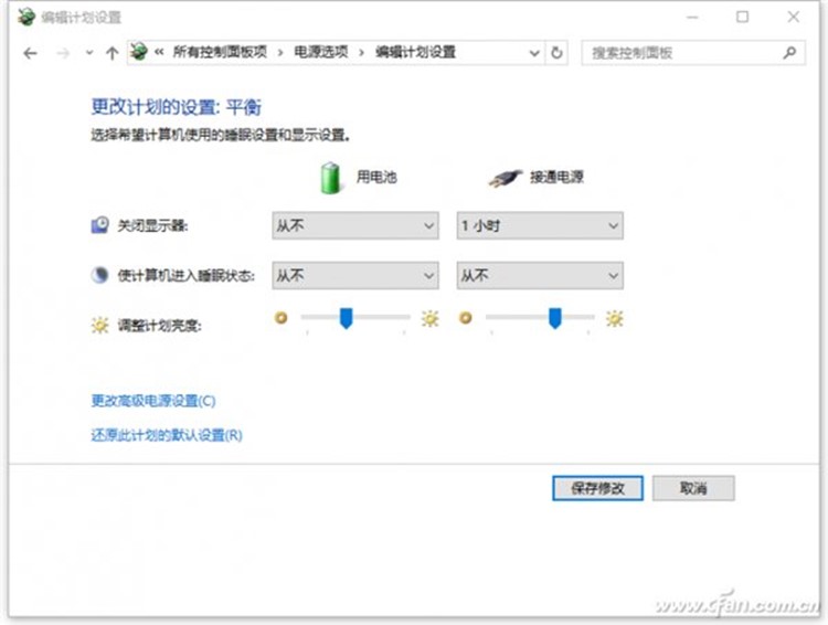 在控制面板中找到"电源选项",对现在正在使用的"电源计划"(如平衡、高性能)进行"更改计划设置"。