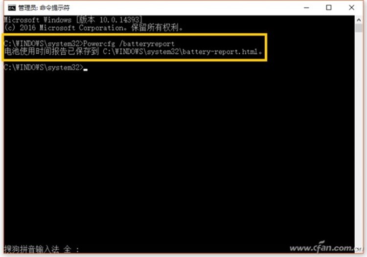 以管理员模式启动命令提示符,输入Powercfg /batteryreport命令后,记录下报告存放的位置。