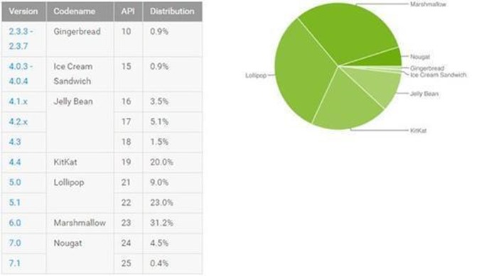 按照NetMarketShare统计数据显示,截至2017年3月,在全球智能手机操作系统中,谷歌的Android市场份额占比达到62.94%,苹果的iOS市场份额占比为33.39%,Windows Phone、Java ME、Symbian等只分享了不到4%的份额,安卓和iOS两大系统已经垄断全球智能手机市场,安卓更是牢牢占据着全球市场头把交椅,但是伴随而来的"碎片化"问题依然严重。