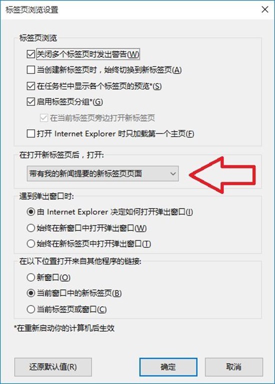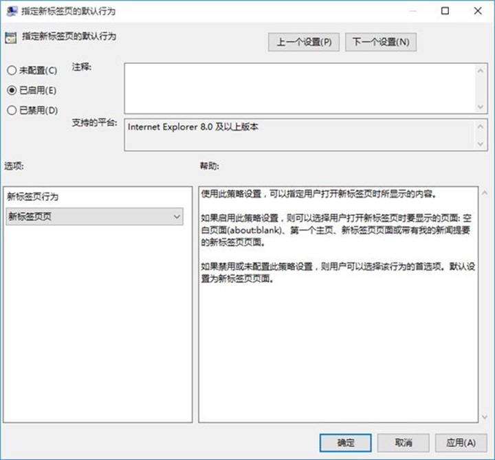 运行组策略(gpedit.msc),定位到"计算机配置-管理模板-Windows组件-Internet Explorer"打开"指定新标签页的默认行为",将配置设置为"已启用",后在下面的"新标签页行为"设置处指定一个你希望使用的行为即可。