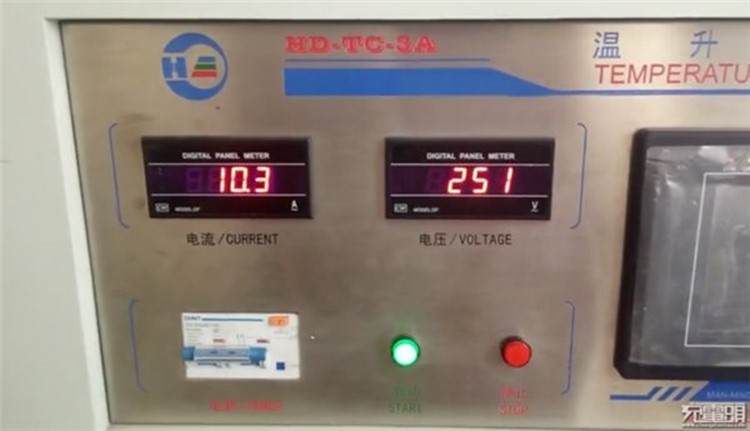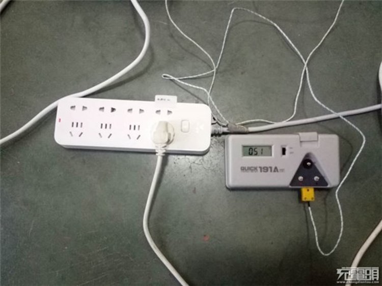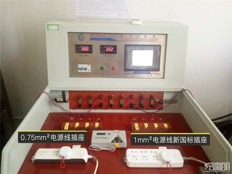 一小时后,温升试验机显示:0.75mm²电源线插座所在的工位一温度为45.1℃,1mm²电源线新国标插座所在的工位五温度为42.3℃,两者温度相差3℃,而这仅仅是在2500W功率下的温度差异,一般电磁炉的功率在2000-3000W,电吹风的功率在1500W-2000W,许多家用电器都可以轻松达到这个功率。