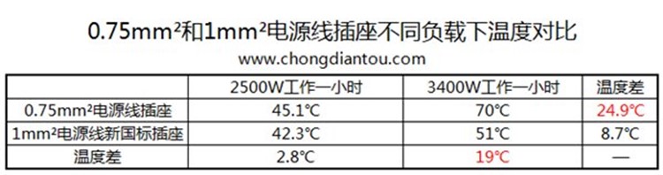 而1mm²电源线现国标插座温度只有51℃,略有烫手感。从实验结果可以看到两者温度相差了近20℃,高下立判。