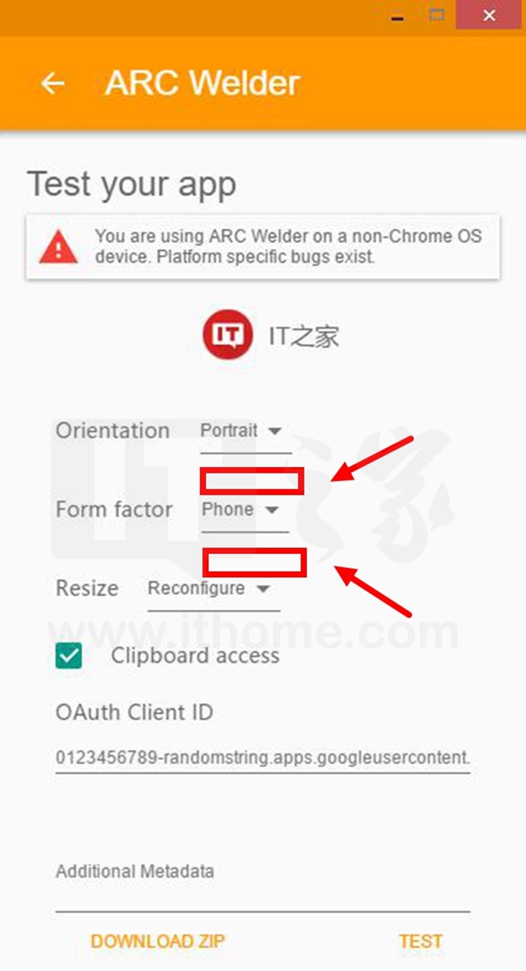 将Orientation选为Portrait,Form factor选为Phone。需要注意的是,这里ARC Welder有个bug,就是下拉菜单无法正常显示,因此,你在执行以上操作时需要进行盲选,比如,在点击过Orientation后,若要在下拉菜单中选择Portrait,你则需要点击图中第一个红框所示的位置。在点击过Form factor后,若要在下拉菜单中选择Phone,你则需要点击图中第二个红框所示的位置。