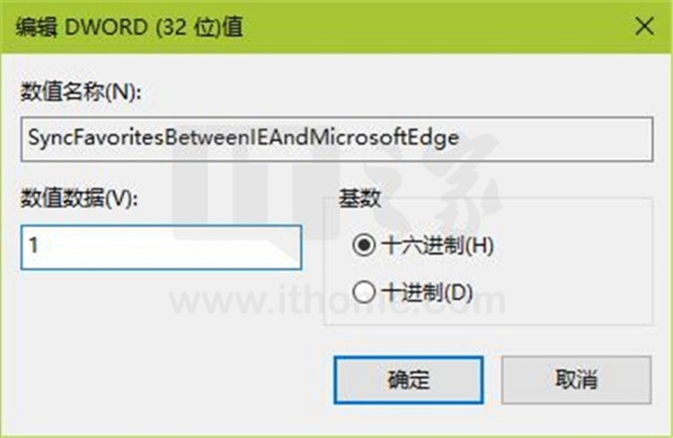 双击你刚刚新建的名为SyncFavoritesBetweenIEAndMicrosoftEdge的DWORD(32位)值,将数值数据下的输入框中的数字设置为1,点击确定,